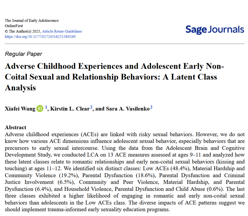 Xiafei Wang, the HEART lab Assistant Director and Associate Professor of Social Work at the University of Kentucky recently published a paper in the Journal of Early Adolescence, along with coauthors Kirstin Clear and Sara Vasilenko. This paper focuses on uncovering patterns of adverse childhood experiences (ACEs) in 9-11 year-old adolescents, and then examining how these patterns were associated with early sexual and romantic behaviors at ages 11-13. In this paper, we uncovered six distinct subgroups marked by different combinations of ACEs, and then found that odds of engaging in early sexual behaviors differed by types of ACEs. In particular, classes marked by parental dysfunction (e.g., mental health issues, substance use, and criminal justice involvement) were associated the highest odds of early kissing, sexual touching, and romantic relationships. This paper is one of the first to use latent class analysis on data on ACEs from the Adolescent Brain and Cognitive Development study, which allows us to understand the impact of different combinations of ACEs on outcomes. In addition, it is one of the few studies focused on predicting early non-coital behaviors.